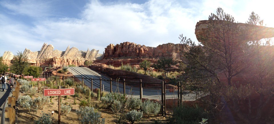 For the both of us this was going to be a new experience. First we walked to Cars Land to check out the waiting line for Radiator Springs Racer or get a Fastpass. Unfortunately there was a technical problem with the attraction so we had to wait. Next thing to do was getting a Fastpasses for World of Color, so we went to Grizzly Peak and got our passes for the 9 o’clock show.