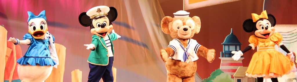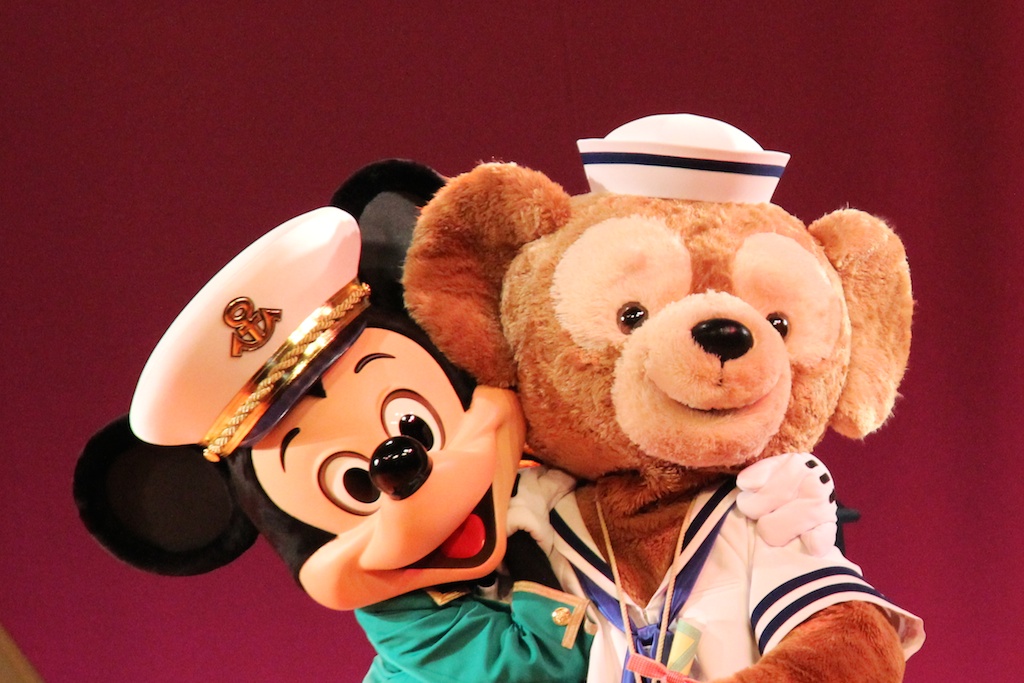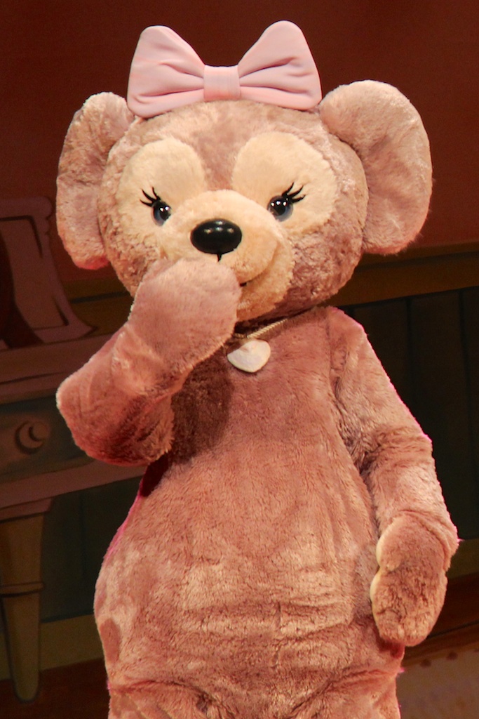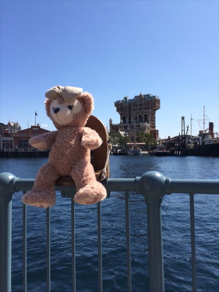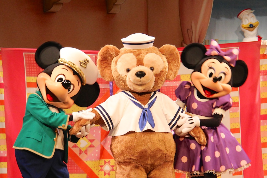 After winning the lottery we went to Cape Cod Cook-off, a restaurant serving burgers and Duffy themed food. During your dinner you’ll seat in a theater where Duffy & Friends are performing on stage. The wait was about an hour according to the cast member at the start of the line. While waiting we saw something interesting, TDR has seats for Duffy installed throughout the park so you can make a picture from Duffy in a lovely setting, I asked a group of girls or I could take a picture with their Duffy.