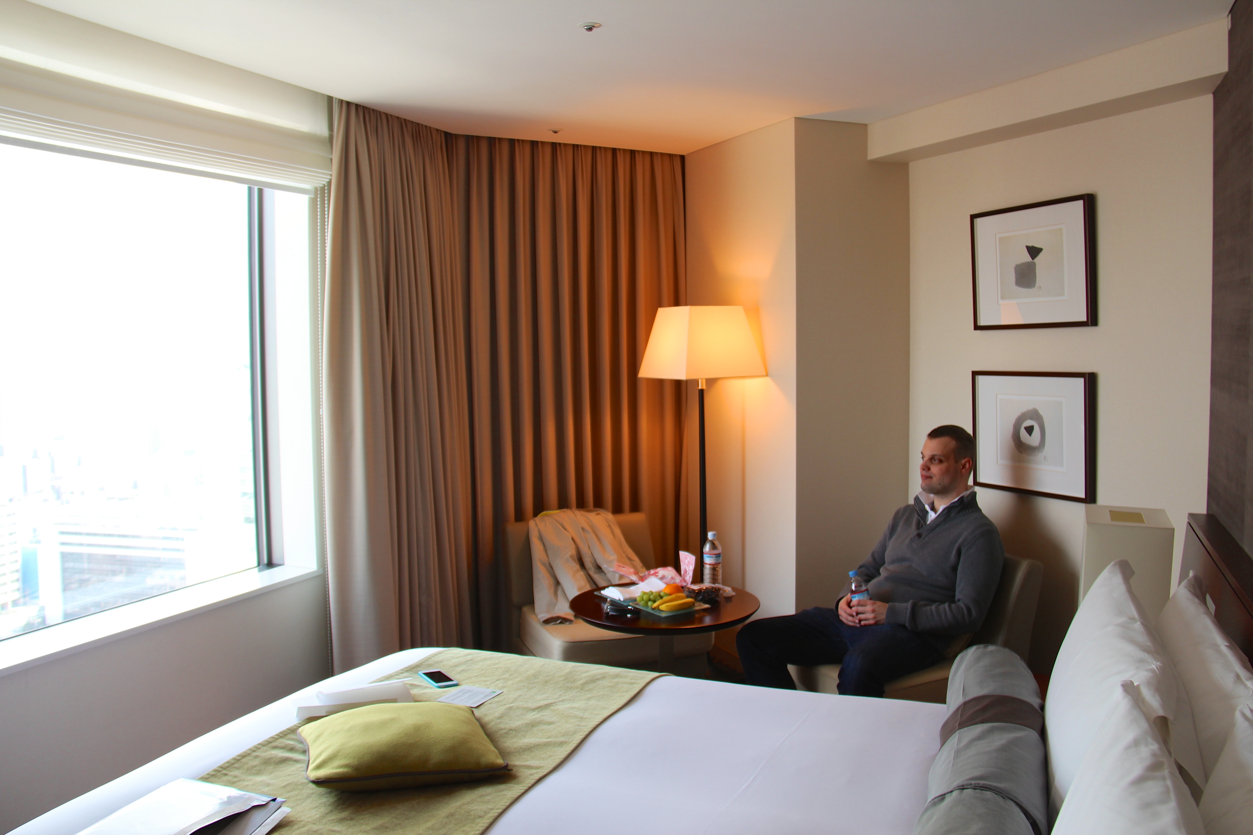 Before we left Narita we had a coffee at the Starbucks to wait for the 11:14 (local Japanese time). After finishing our coffee we walk towards platform 1 where we boarded for a 68 minutes train ride towards Shinagawa Station. After our arrival we walked straight to our hotel and after checking we only had to wait 25 minutes before our room was ready. We stay at the 27th floor, get every day 2 new bottles of water, had fruit on arrival and on top of that we got upgrade towards a Premium King. During the wait for our room keys we also got our mail which contained the train tickets and also very important the Mobile Hotspot from a local provider.