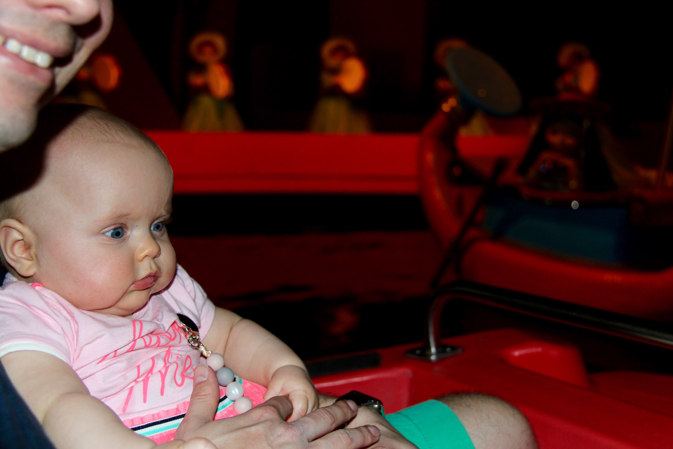 When we got on the back of Dumbo, I found one in front of Emily and mommy to take pictures. It was hard to take pictures while she was looking around and I was sitting backwards but I can tell you she enjoyed it to the fullest.