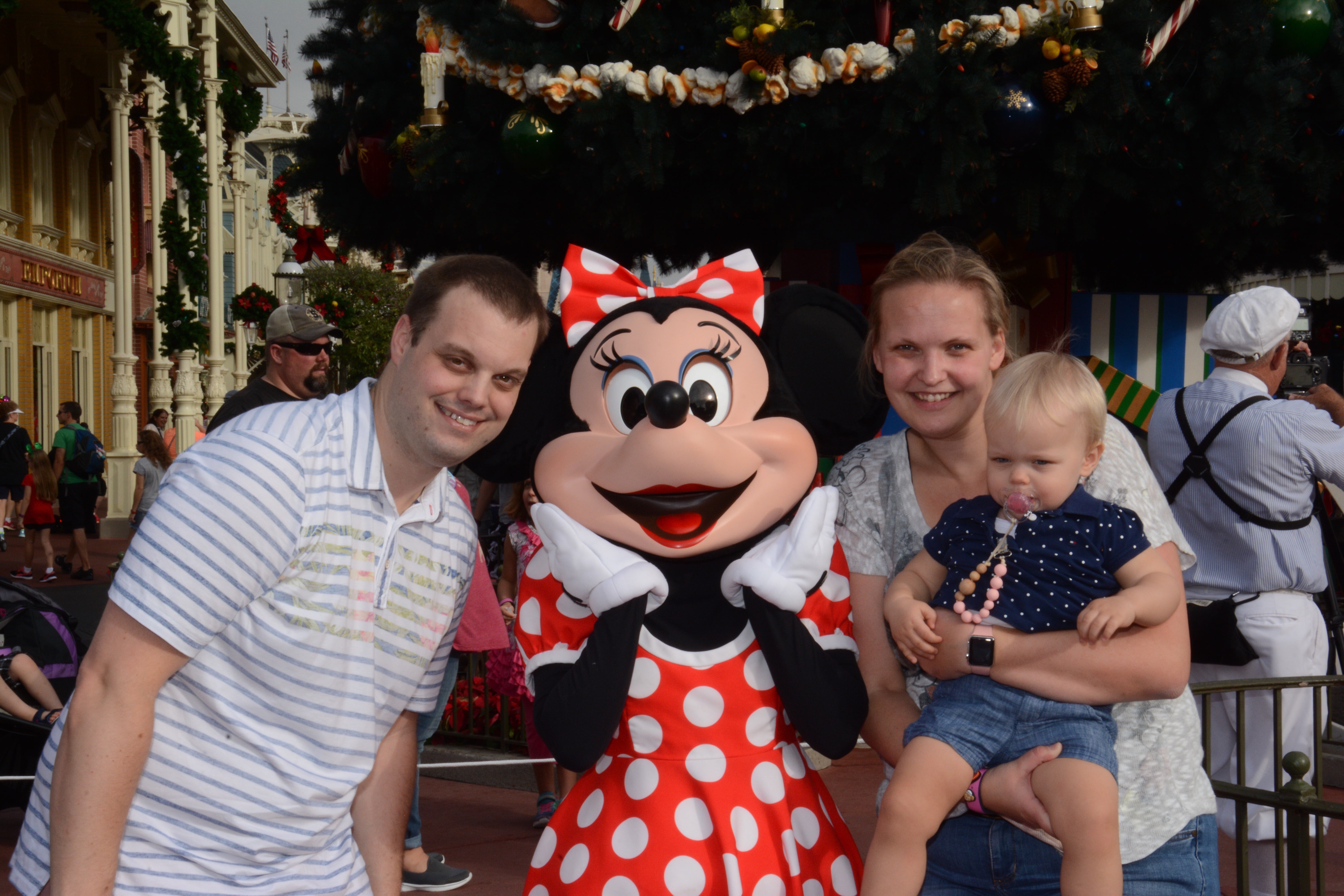 We parked at the Ticket & Transportation and much to our surprise we could take the black monorail (they have different striping) directly to the gates. At 9:00 sharp we walked through the tunnels under the railroad track. We were just in time to queue up for a picture with the one and only Minnie Mouse with a beautiful Christmas tree as backdrop.